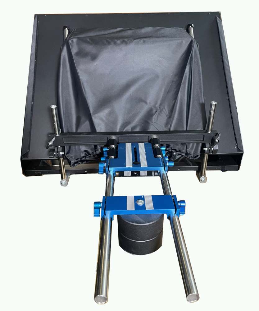 The basis of this design of prompter is Base plate platform made of polished stainless steel tubes, where are three movable mounting plates and mounting hardware for front part of the prompter (tube with a mirror and a monitor). The upper mounting plate is designed to mount the camcorder. The lower plate provides mount on a pedestal or tripod. The back plate - for set the counterweight for balancing system.