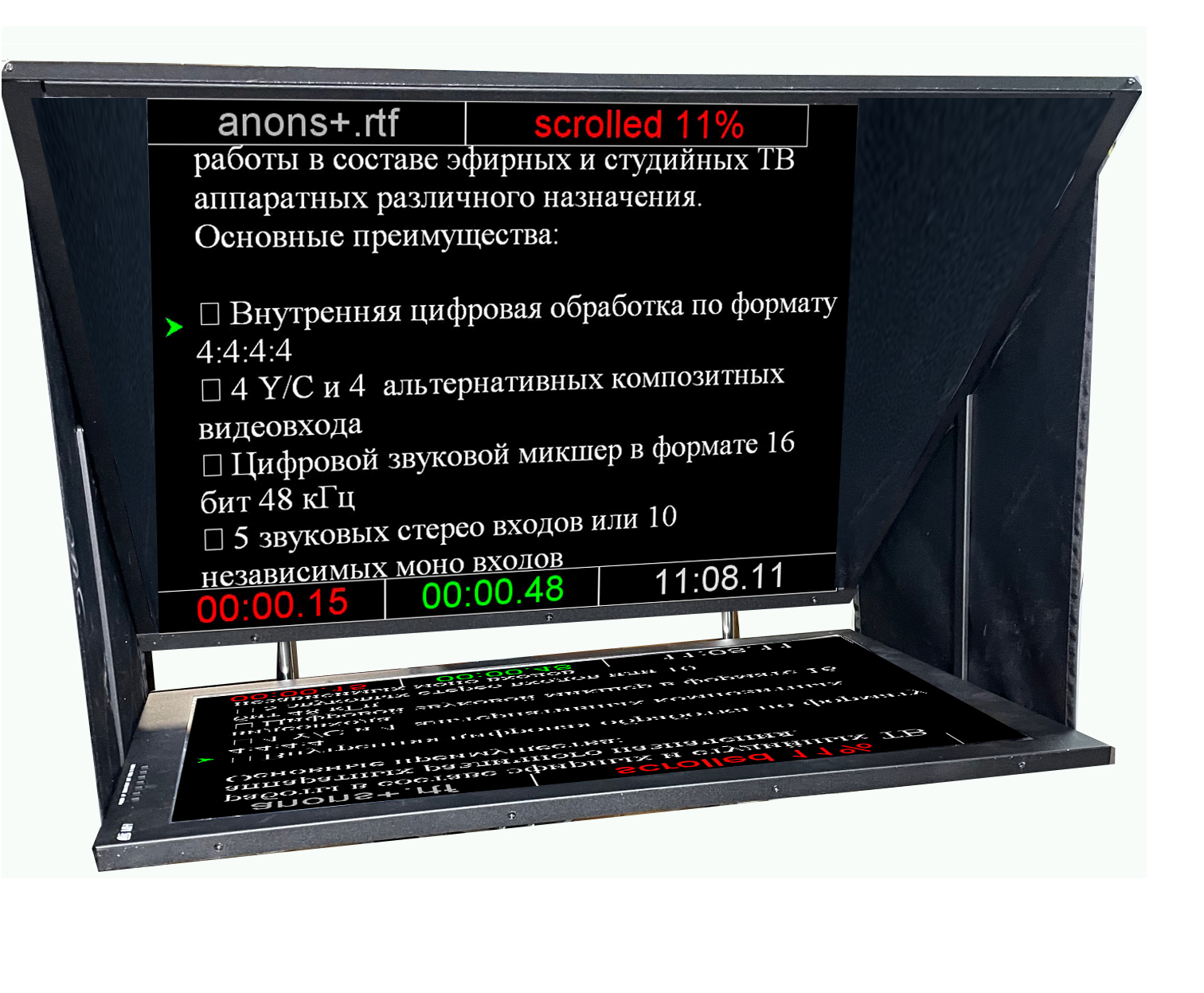 Professional prompter VSS-27Pro is constructed under the traditional scheme and intended for a projection of the readable text to the translucent glass located in front of the camera lens. The text are completely reflected in the direction of the announcer, without falling into formed by the camera the video signal. Provides video shootings with any types of videocameras.